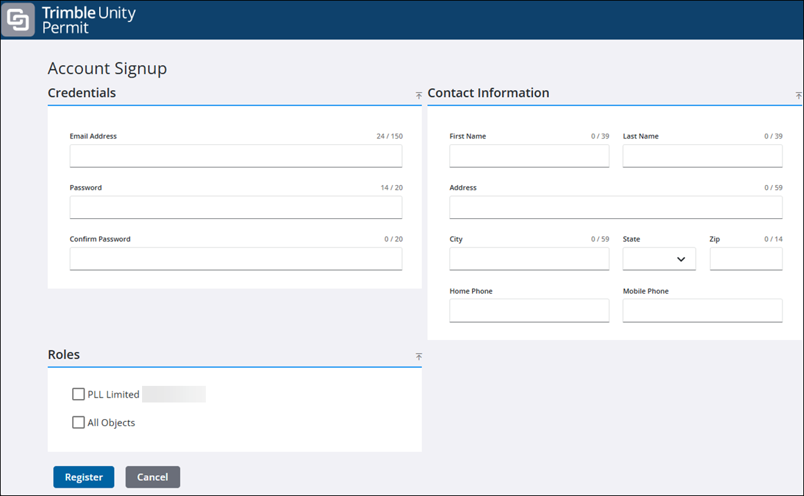 - In the Account Signup panel, enter your email address, password, and contact information.