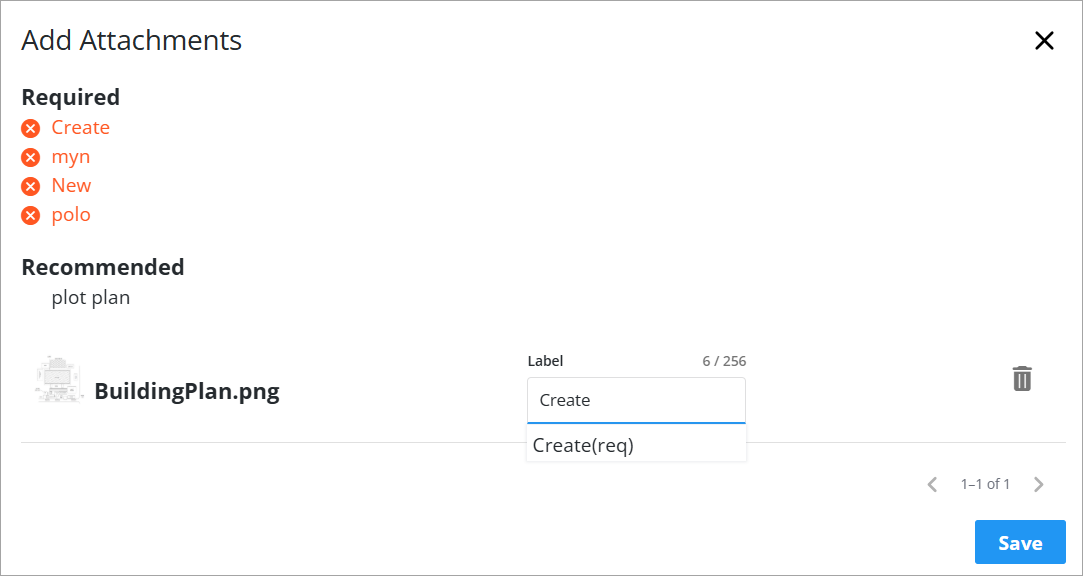 - Once an attachment is added, use the Label drop-down list to select a label for the document and click Save.