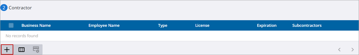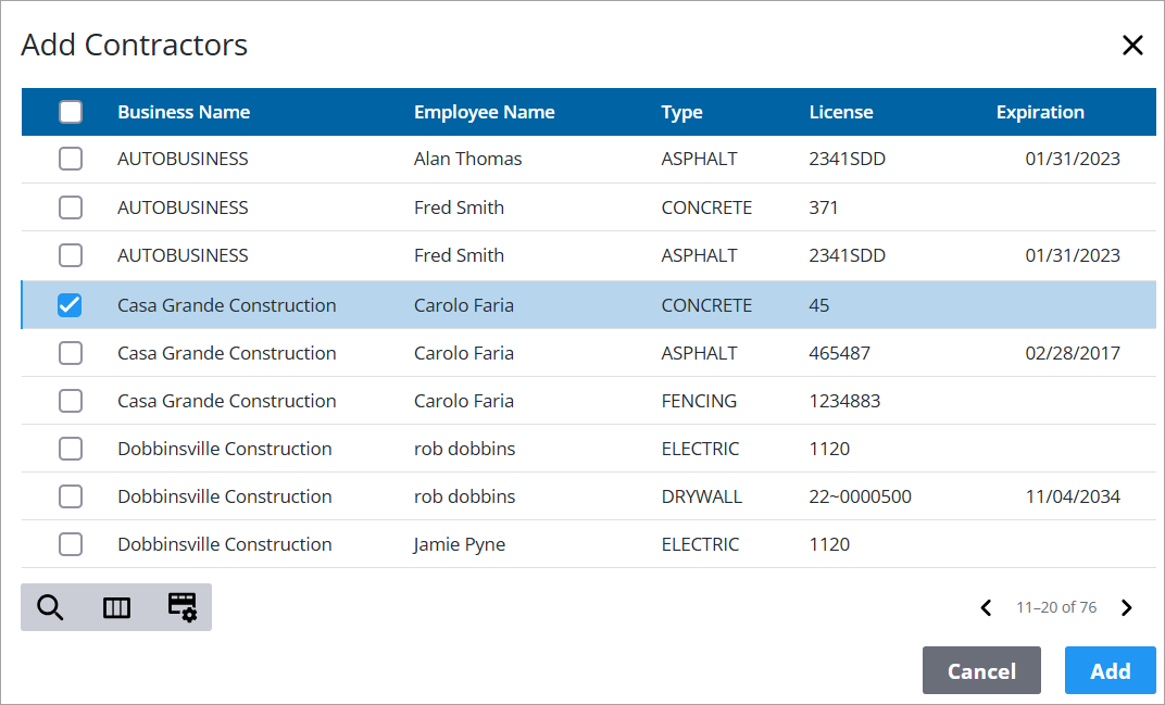 - Click Add record to open a list of contractors. The list shows contractors with local or state licenses. If a contractor has both a local and state license, it is shown in the list twice.