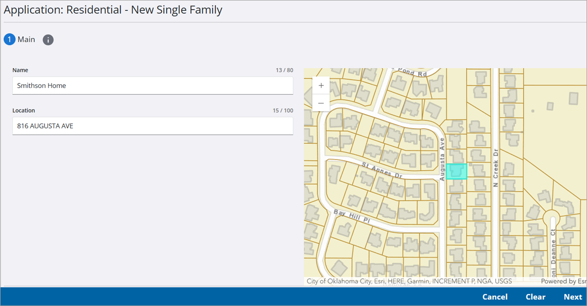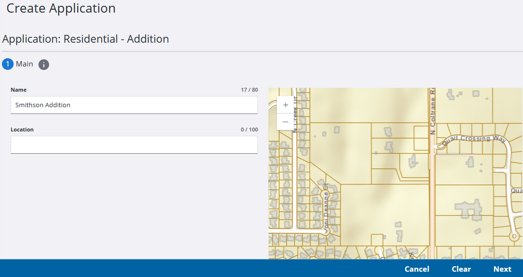 The Create Application page opens. If the administrator has configured it, a Show help icon appears next to each panel name. See Guided Access in the Admin Guide for Trimble Unity Maintain and Trimble Unity Permit for more information. Administrators can customize the size of the panels and set the default font size for guided access in Admin. See Configure Public Access Preferences in the Admin Guide for Trimble Unity Maintain and Trimble Unity Permit for more information.