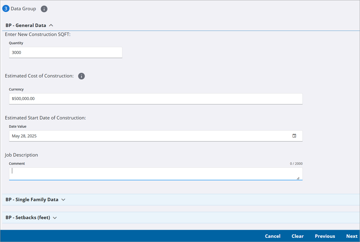 The Data Group panel requests specific information about your project. The fields vary depending on the kind of case you are creating. The information collected here may be used to calculate fees. Required fields are marked in red. When adding Data Groups, some fields, such as the zip code, can automatically populate based on the selected asset on the map. If the user changes the asset on the case before submission, the case data will update to reflect the new asset.