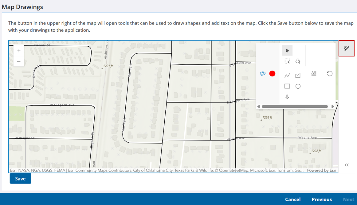 NOTE: The Draw map tool is very similar to the Redline map tool in Respond except that it uses a Save button rather than an Export option. The functionality is otherwise identical. See Redline in the Respond Guide for Trimble Unity Maintain and Trimble Unity Permit for more information.