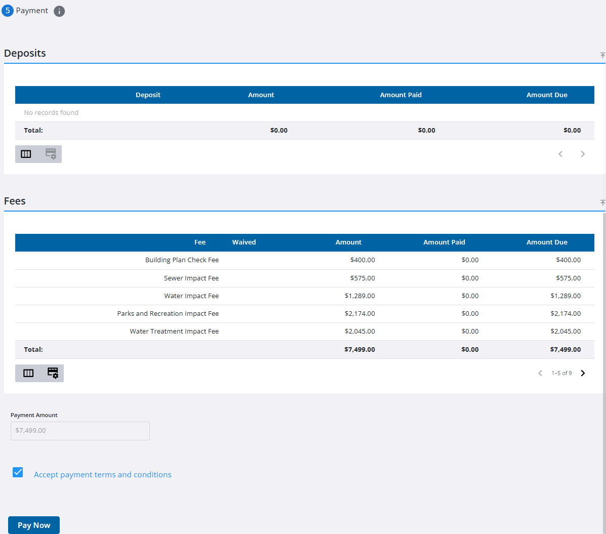 The Payment panel displays all the deposits and fees attached to your application. Administrators can configure a case template to require fees be paid in full when a case is submitted. See Configure Public Access Options on a Case Template in the Admin Guide for Trimble Unity Maintain and Trimble Unity Permit for more information. On cases of this type, the Pay Now button is the only option that displays and no partial payments are allowed. The case is submitted after the payment successfully posts.