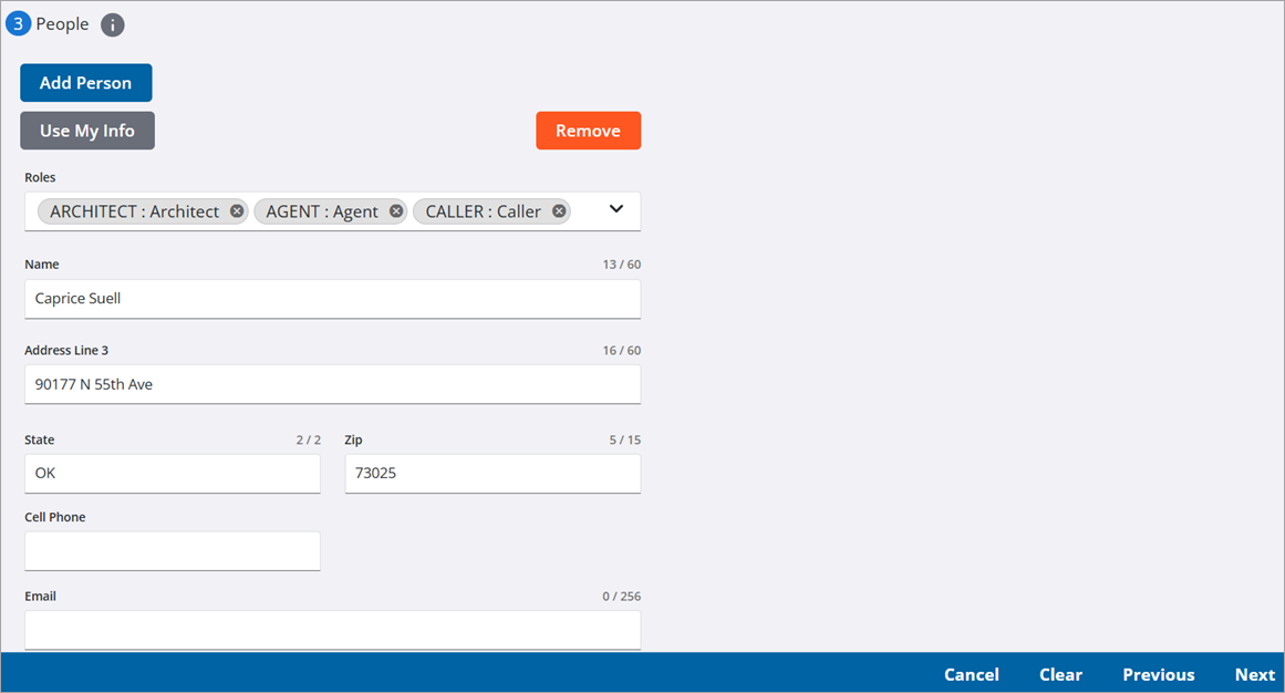 The People panel is used to enter the name and contact information of people involved with the permit or license. This panel varies depending on the type of case. Items in red are required fields. If configured by the administrator, when an asset is added as an address, any people associated to that asset are automatically added to the People panel. See Configure GIS Data Fields in the Admin Guide for Trimble Unity Maintain and Trimble Unity Permit for more information.