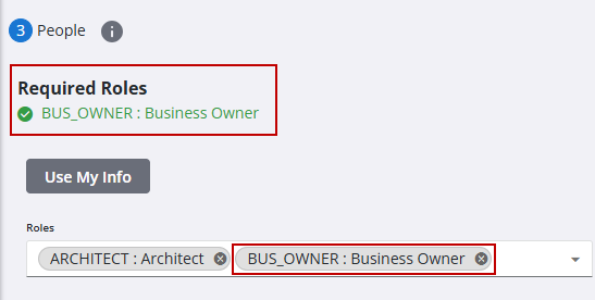 If the administrator configured a case template to require one or more roles, a Required Roles notice displays at the top of the People section. A required role must always be assigned to at least one person. If the required role is not assigned or is removed, the case cannot move forward.