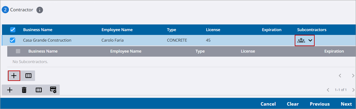 The Contractor panel allows you to select contractors and subcontractors for your application. By default, only contractors with current licenses appear in this list. Contractors with expired licenses are not listed unless an administrator enables the Allow Expired Contractors setting in Admin. See Configure Public Access Preferences in the Admin Guide for Trimble Unity Maintain and Trimble Unity Permit for more information.