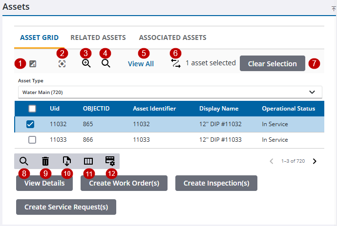 - Zoom On Map: Click to zoom to the selected assets on the map. If less than two assets are selected, the map will center on the assets.