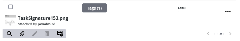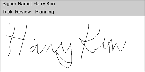 When you view the signature, it shows the signer's typed name or initials, a description of the task, and the digital signature.