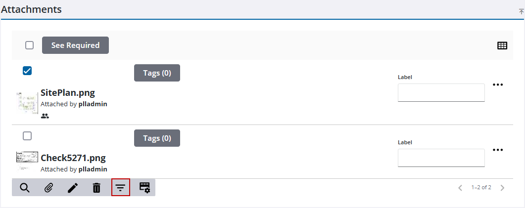 You can filter attachments on a work activity either from the Attachments panel on the work activity or the Attachments page on a work order, inspection, service request, or case.