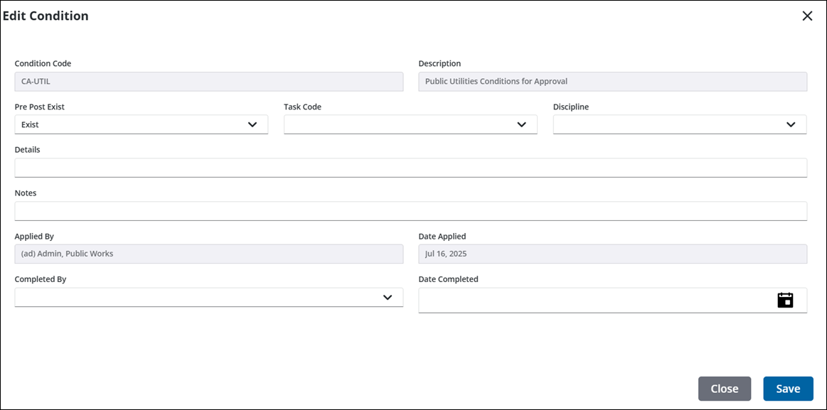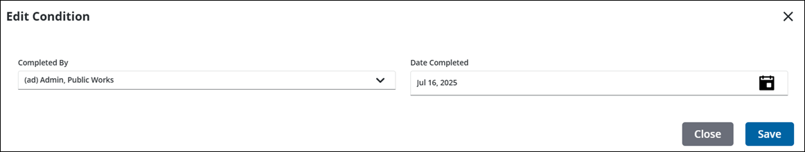 The Edit Condition panel opens. The Completed By and Date Completed fields are populated with the current user's login and date, but can be changed if desired.
