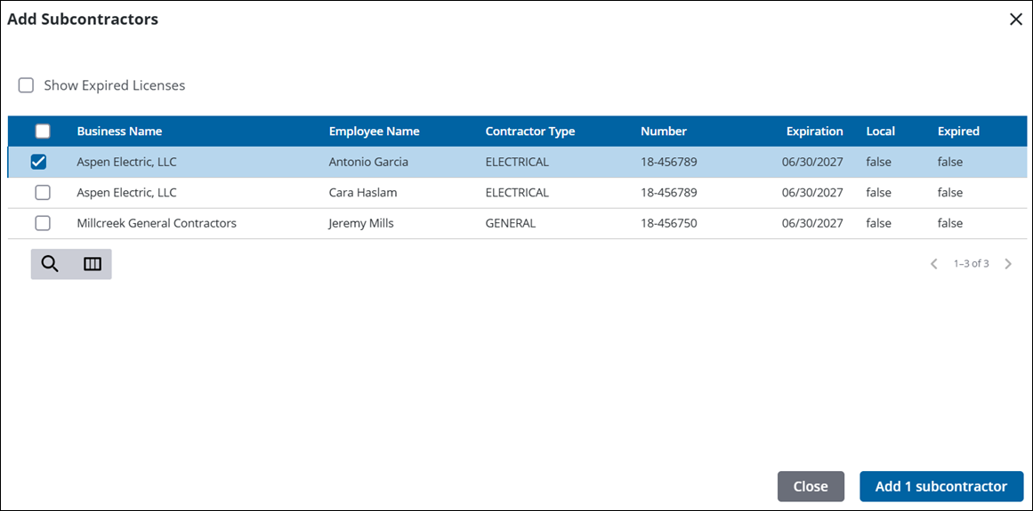 Subcontractor(s) are added to the Subcontractors section. From here you can search, add, and remove subcontractors as well as view existing subcontractors.