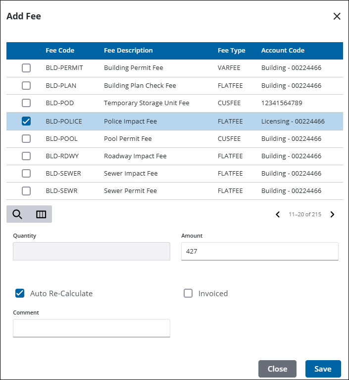 - Select a fee to open additional fields. The Amount automatically populates, but can be changed.