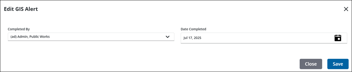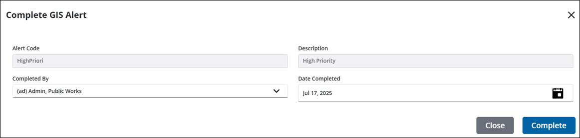 The Complete GIS Alert panel opens. The Completed By and Date Completed fields are populated with the current user's login and date, but can be changed if desired.