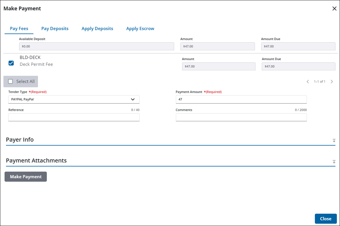 Payments can be made towards fees or deposits as well as made towards fees from paid deposits that are associated to a case. The administrator can set specific fees which can be paid using a contractor's escrow account. Making a payment towards fees or deposits uses the same process in the Make Payment panel, but is accessed differently.