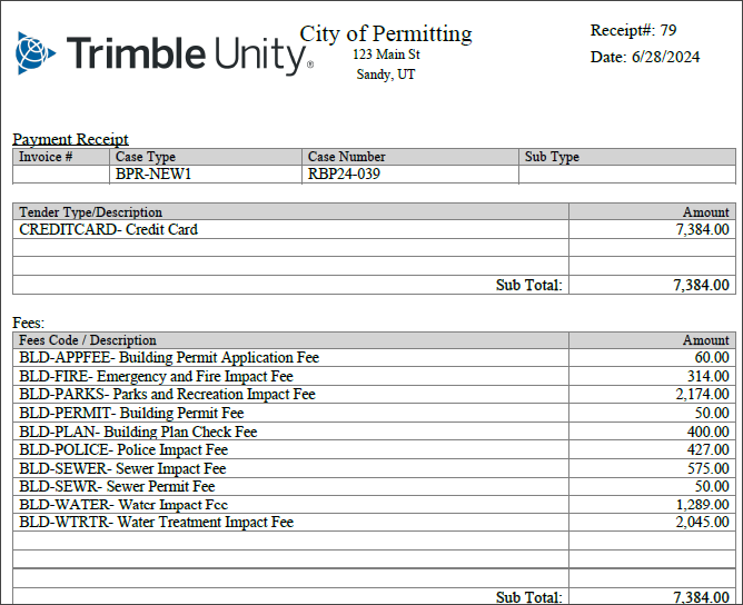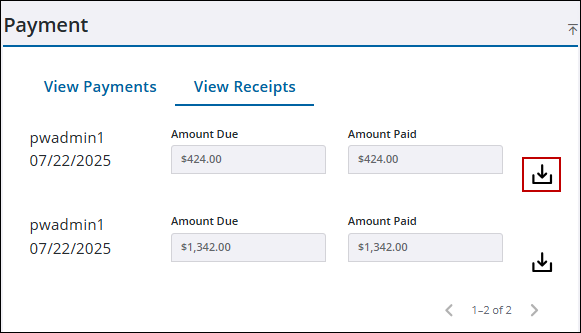 A PDF file downloads and, when opened, shows information pertaining to the receipt, such as which fee(s) were paid and the form of payment.