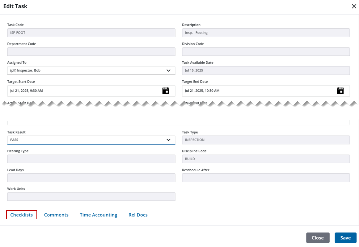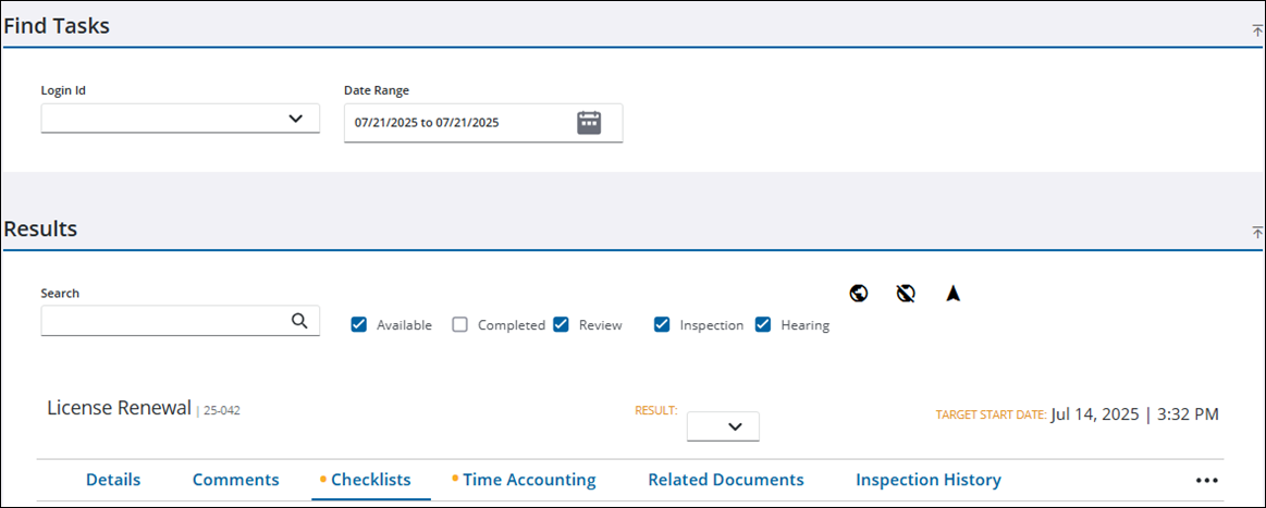 Some tasks have checklist items attached to them. If it's configured in Admin, checklist items must be completed before the task can be completed in the workflow. You can add, remove, or complete checklists.