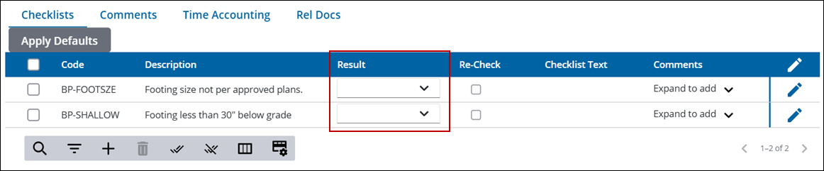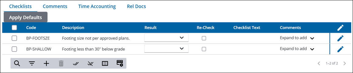 - Click Apply Defaults at the top of the checklists panel, or the Apply Defaults icon from the toolbar at the bottom of the checklists panel. This applies the default status to all of the checklists in the list. The status is set to each checklist based on the default results for the status group the checklist is a part of. Checklists that already have a status or the status group does not have a default status are not updated when Apply Defaults is used.