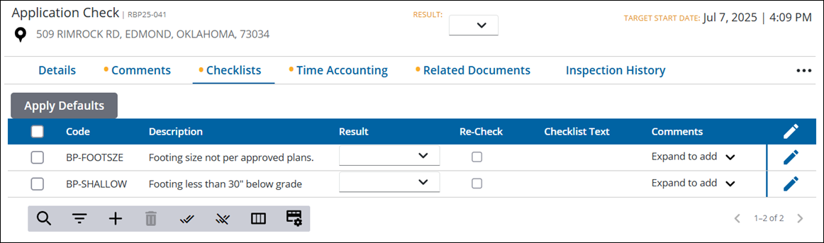 - Click Apply Defaults at the top of the checklist panel, or the Apply Defaults icon at the bottom of the checklists panel. This applies the default status to all of the checklists in the list. The status is set to each checklist based on the default results for the status group the checklist is a part of. Checklists are not updated when Apply Defaults is used if they already have a status or the status group does not have a default status.