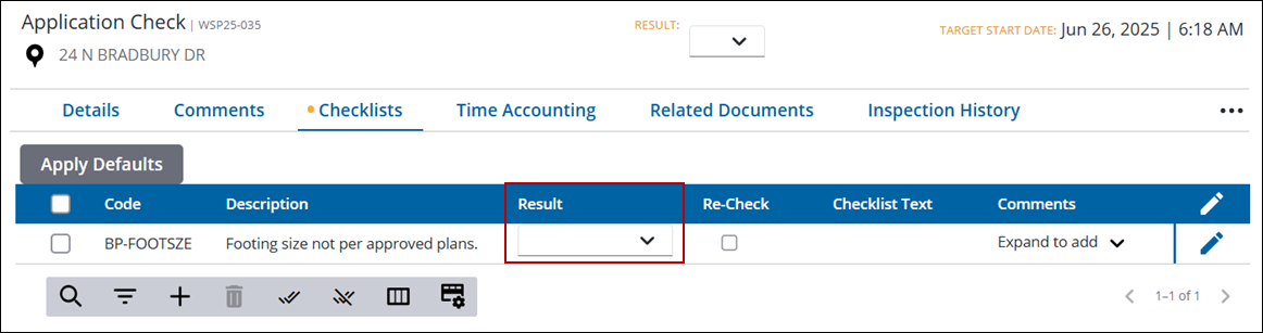 - Find the checklist you want to complete and select a result from the Result drop-down list, such as if it passes, fails, is approved, or should be resubmitted. The result codes available in the drop-down list vary depending on the checklist.