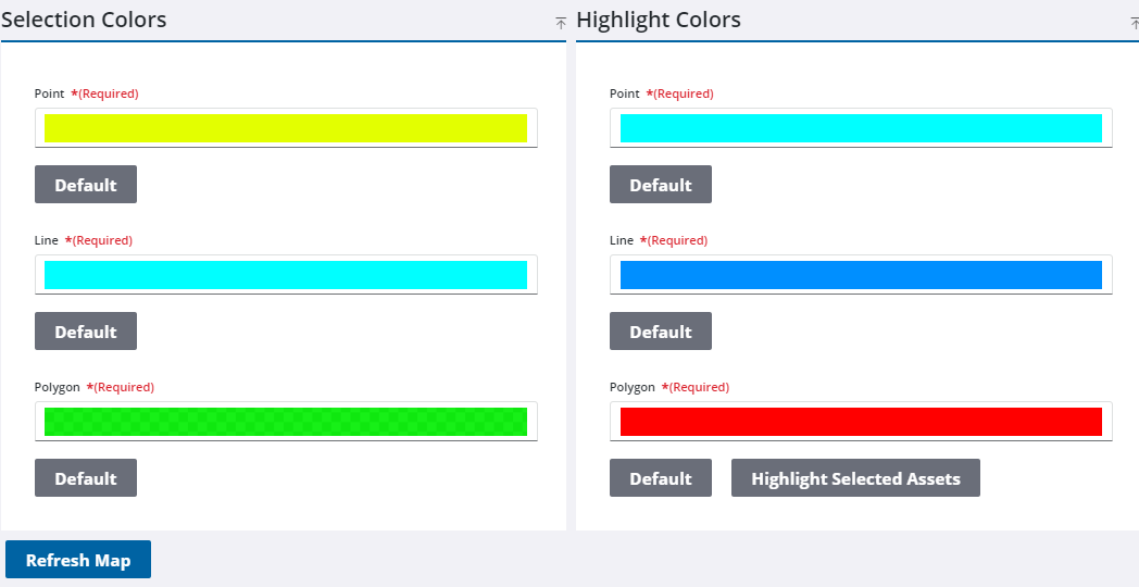 User map settings can be defined, such as the colors used in the map when assets are selected or highlighted.