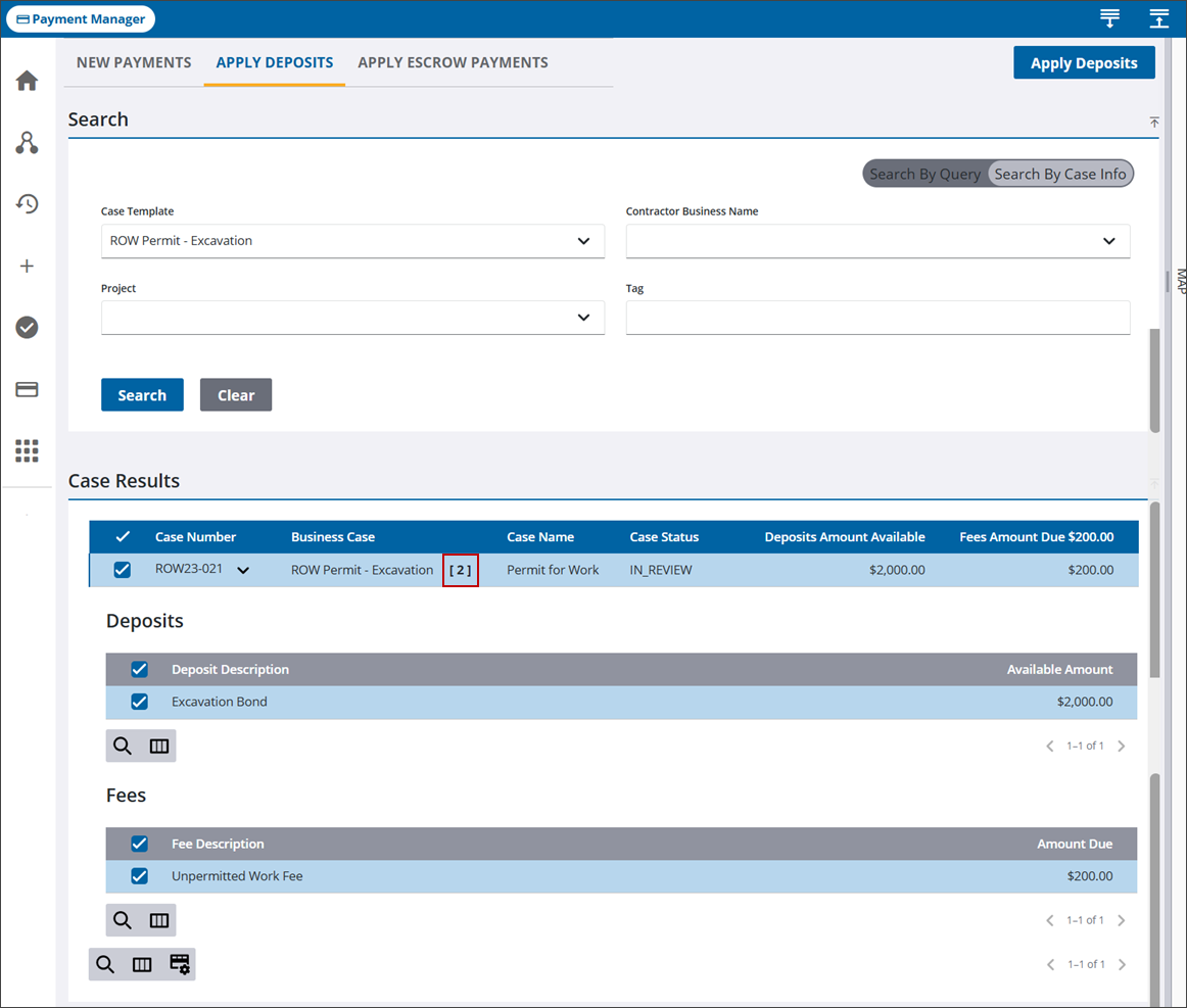 Use Payment Manager to pay selected fees using deposits associated to the case.