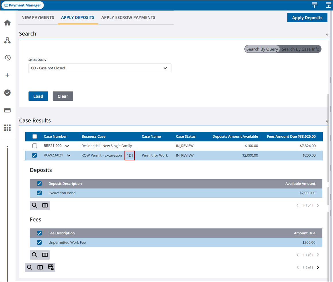 - Select the check box for one or more cases to apply any paid deposits to unpaid fees. You can also click the arrow to expand each case and select individual fees and deposits in the Deposits and Fees sections.