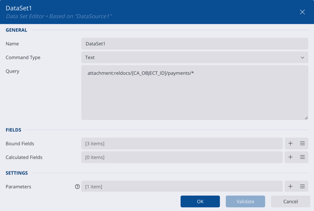 After a custom data source is added, a data set should be added with a query pointing to where the wanted attachments are.
