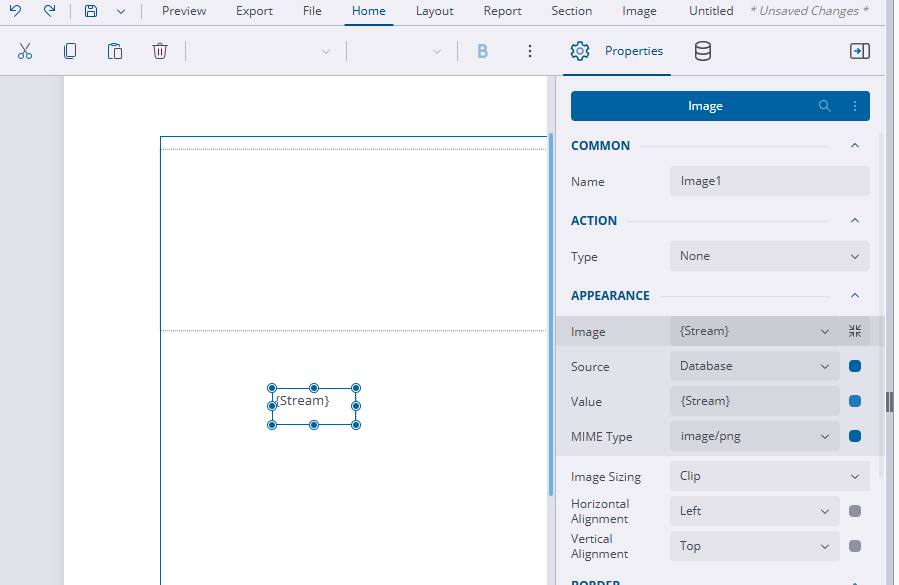 IMPORTANT: If you add an image control and render the stream content in it outside of a table or in a container, only the first image in the series renders. No images render in a banded list.