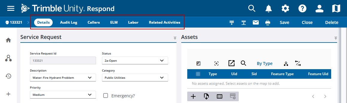 NOTE: The panel names appearing on the Service Request page are the default labels, but may be changed using Trimble Unity Style. See the Style Guide for Trimble Unity Maintain and Trimble Unity Permit for more information.