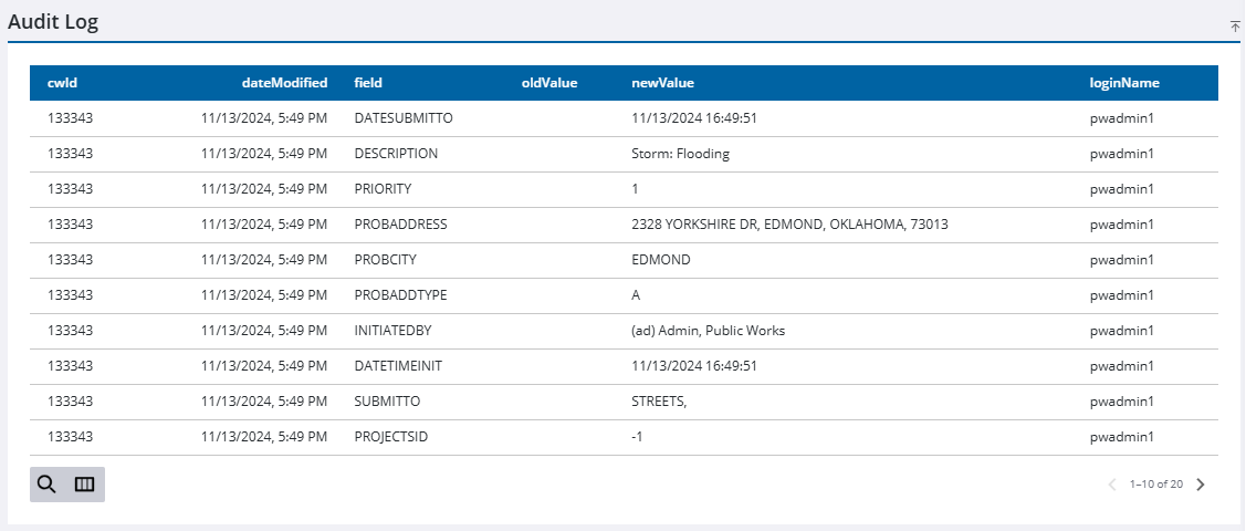 The audit log shows any changes made to the service request. The domain administrator determines which fields are tracked in Admin.