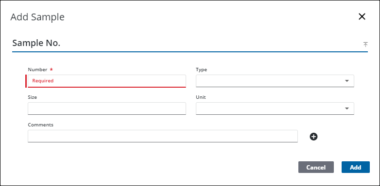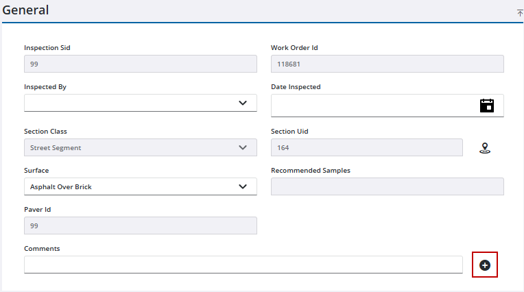 Enter information to the Add Sample panel. See Pavement Inspection Fields for more information about the fields.