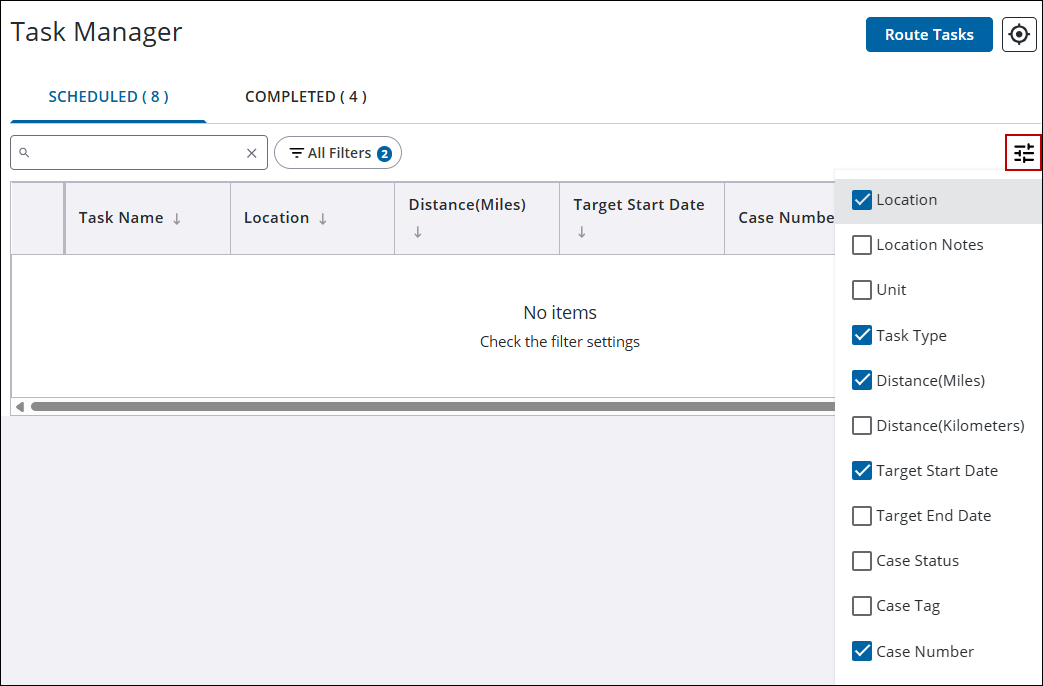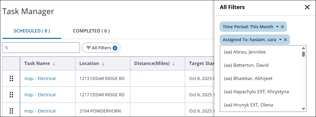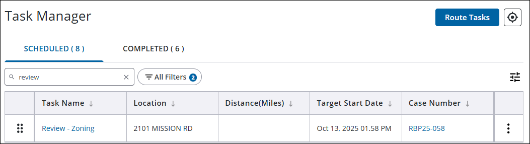 Use Task Manager to locate tasks assigned to a user by date range. Tasks are divided into Scheduled and Completed tabs. You can complete a task, mark a task as important, show the task on the map, route tasks, and cancel the task from the Scheduled tab. If you are signed in as the Assigned To user, you can reorder your task sequence by using the drag and drop function.