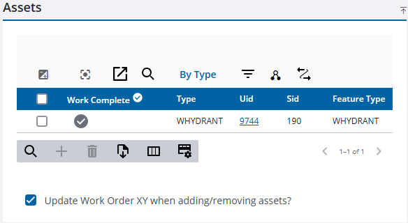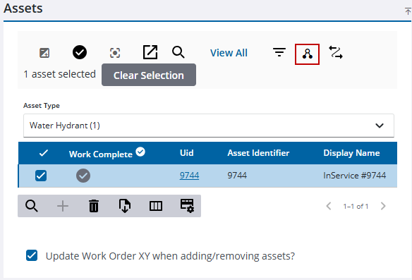 The Assets panel lists all assets attached to a work order and has two views: one that shows all assets and one that shows a single asset type. The number of total assets is listed at the bottom of the panel.