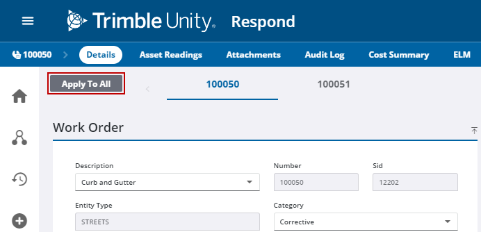 - Click the drop-down list for each individual work order to edit the fields one-by-one, or click Apply to All next to a field to apply that definition to every work order.