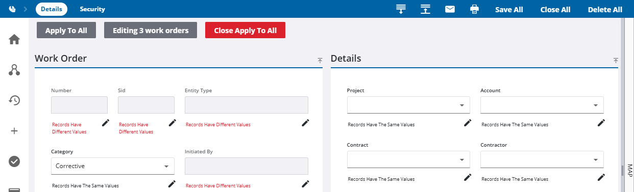 If values are the same across all the work orders, the field can be edited and it says Records have the same value. If values for a field differ between the different work orders, the field is grayed out and it says Records Have Different Values.