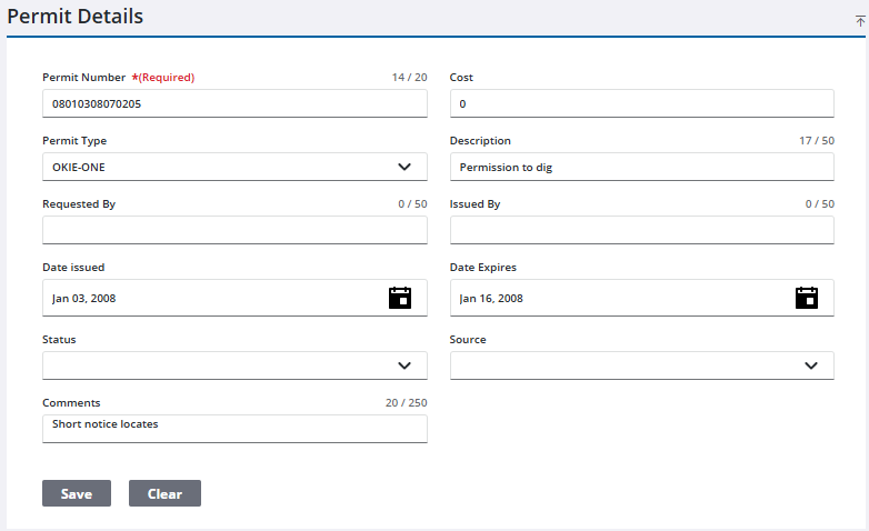 Details about the permit appear in the Permit Details panel. See Work Order Fields for an explanation of fields.