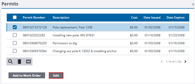 The Work Order Permits panel displays all the permits that have been associated with the work order. The Permits panel displays all the permits that have been created for any work order.
