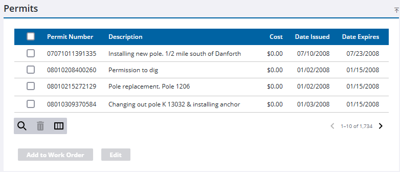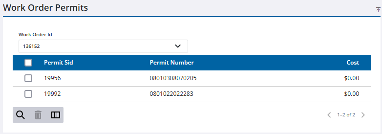 The Work Order Permits panel displays all the permits that have been associated with the work order.
