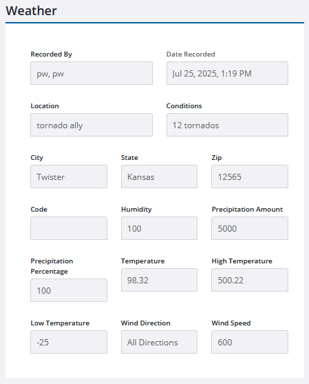 Weather data can be captured in the Trimble Unity Field app and can be viewed for the work activity in Respond.