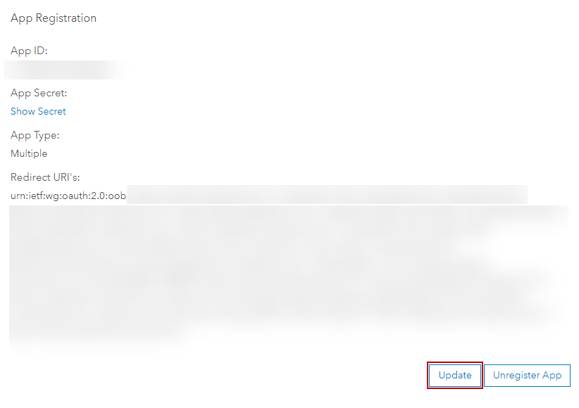 - Return to your Portal for ArcGIS account and click Update next to the application.
