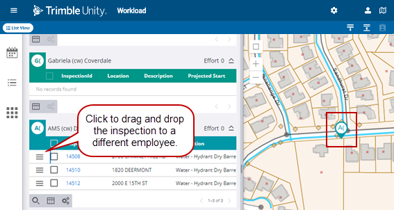 You can quickly assign inspections by dragging and dropping them to an employee. Since drag and drop does not work on mobile devices, this method is recommended for desktop devices.